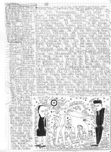 Kommentar den 5 oktober 2023: Några år efter att detta skrevs skickades jag att intervjua Martin Luuk, då aktuell med boken Ingen vet vem jag är i mitt träd. Han hade några år tidigare publicerat sig medelst affischering i form av ett verk vid namn Stockholm brinner (inte) igen, och vi hade ett givande och entusiastiskt samtal om särlingskonst, som han inte helt oväntat visade sig vara en varm anhängare av. Vi avhandlade andra gatukonstnärer i Stockholmmiljö, såsom Ernesto Guerra, vars signum är upptejpade A4-sidor med det egna namnet på, och vars konstnärskap Martin inte höll särskilt högt: desto mer Renate Bauer, som alltså ligger bakom de mycket tätskrivna och karaktäristiskt illustrerade anslag som man i decennier sett på anslagstavlor lite överallt i Stockholm. “Där finns ett stort djup”, kommer jag ihåg att Martin utlät. Enligt det fåtal andra källor som nämner något om Bauer har jag fått tips om att det inte finns någon större poäng med att försöka begripa innehållet (vilket för övrigt påminner mig om förordet till min upplaga av Immanuel Kants A critique of pure reason, enda gången ett företal aktivt avrått mig från att läsa resten av boken), samt att kontakter med konstnären själv då hon ertappas i samband med affischeringen inte alltid bär goda frukter.